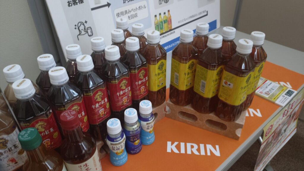 自社商品展示や2023年に舞鶴市、豊田通商株式会社と締結したペットボトルの『ボトル to ボトル』水平リサイクル活動紹介を展示。自治体と連携した取組みとして大きくPRされています。